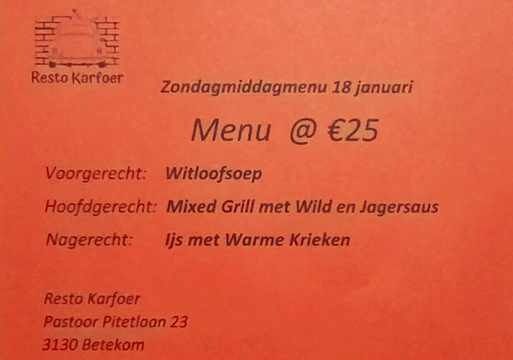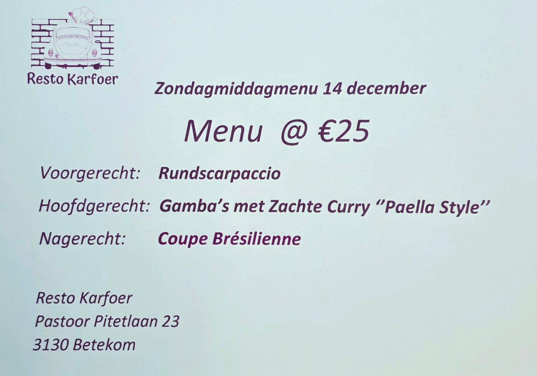Geniet elke zondag van een heerlijk en verzorgd driegangenmenu, speciaal samengesteld om uw weekend in alle rust en smaak af te sluiten. Voor slechts €25 per persoon